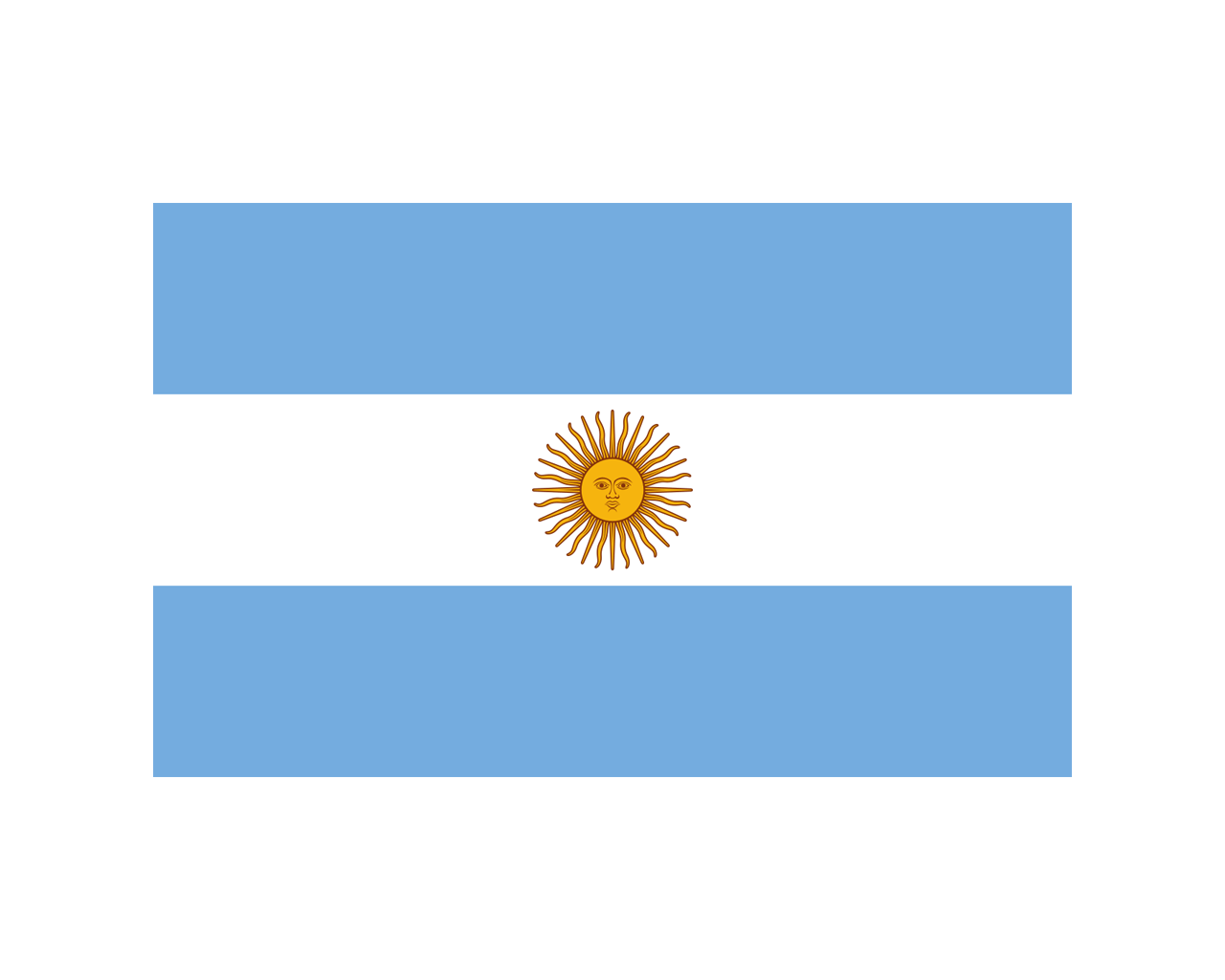 阿根廷共和國(The Republic of Argentina),簡稱阿根廷( Argentina),是由23個省和聯邦首都組成的總統制聯邦共和制國家,位于南美洲東南部,首都布宜諾斯艾利斯。阿根廷國旗呈長方形,長與寬之比約為5:3。自上而下由淺藍、白、淺藍三個平行相等的橫長方形組成,白色長方形中間是一輪“五月的太陽”。太陽本體酷似一張人臉,是阿根廷發行的第一枚硬幣的圖案,沿太陽本體圓周等距離分布著32根彎直相間的光芒線。淺藍色象征正義,白色象征信念、純潔、正直和高尚。“五月的太陽”象征自由和黎明。