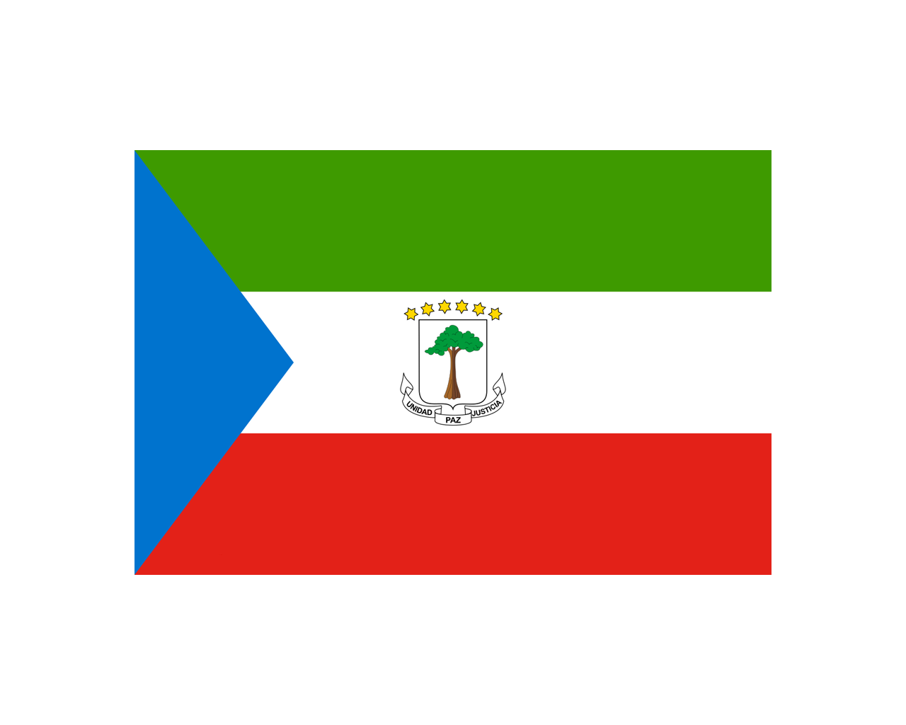 赤道幾內亞共和國(The Republic of Equatorial Guinea),位于非洲中西部,西臨大西洋,北鄰喀麥隆,東、南與加蓬接壤,首都馬拉博。赤道幾內亞國旗為長方形,長寬之比為3:2。靠旗桿一側為藍色等腰三角形,右側為三個平行寬條,自上而下分別為綠、白、紅三色,旗面中央有國徽圖案。綠色象征財富,白色象征和平,紅色象征為獨立而斗爭的精神,藍色象征海洋。