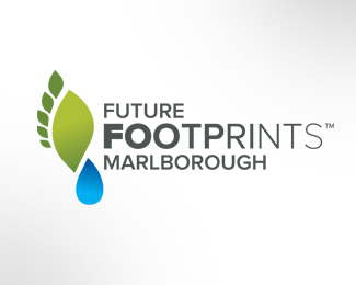 Future Footprints未來腳印抽象標志創意設計,該標志融入葉子和水滴的元素組合成腳印的圖形,整體以藍色和綠色作為主識別色,可以應用于未來科技或生態相關的創意標志設計。
